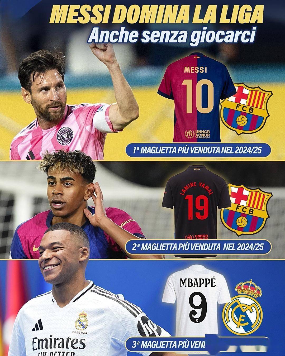 2024/25赛季西甲球衣销量情况出炉,梅西早已经转会到美职联迈阿密国际,虽然梅西未在西甲赛场征战,但其巴萨10号球衣却登顶销量榜。意不意外,惊不惊喜!?
