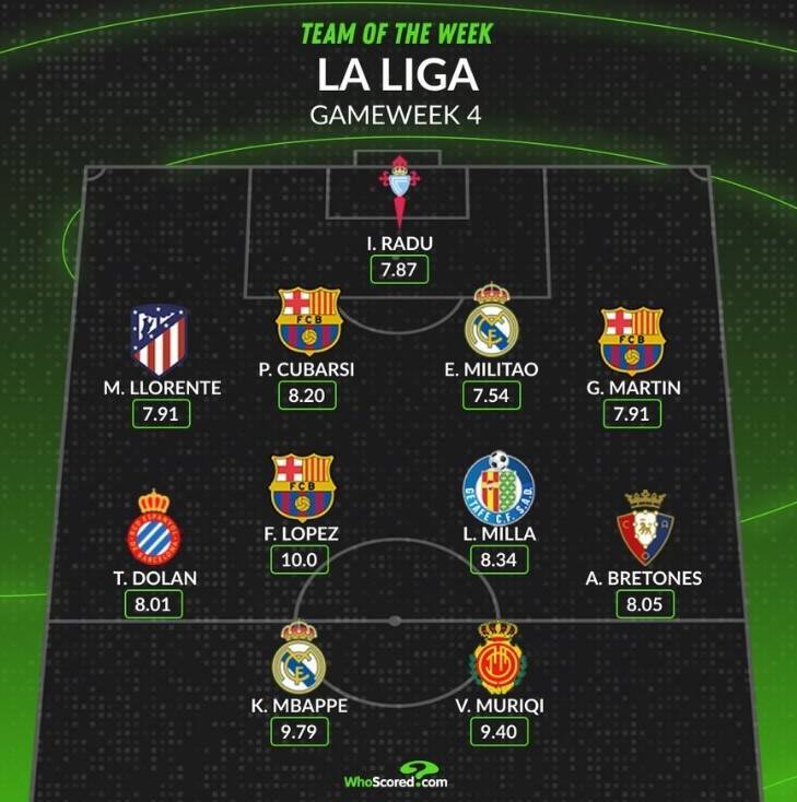 直播吧9月16日讯 本轮西甲战罢,数据网站Whoscored也评出本轮西甲最佳阵,具体如下: